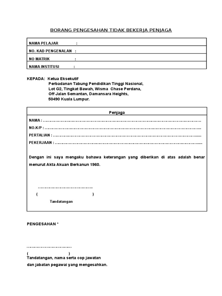 Borang Pengesahan Tidak Bekerja Penjaga Pdf